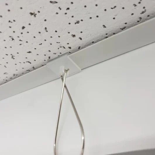 This T-Rail Plastic Slide Clip Hook slides onto a suspended ceiling grid to allow for the hanging of posters.